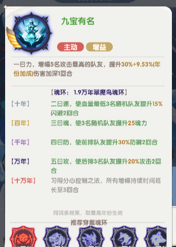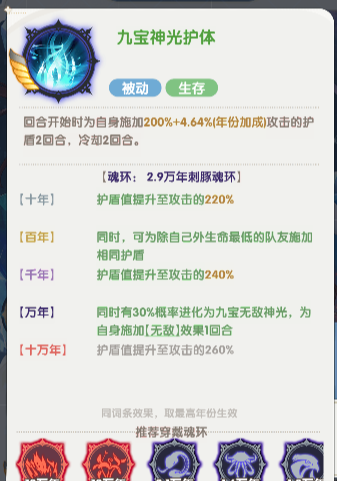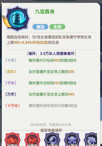 每回合结束时,为1名生命最低的队友恢复宁荣荣生命上限10%+(年份加成)的生命