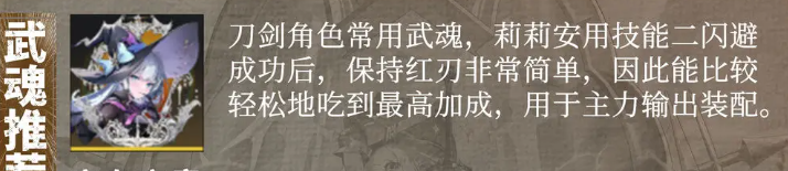 而且她连招上面闪避敌人攻击之后,还可以直接使用一个技能1,只要此时的技能1蓄力完全的话,后期达成的闪避输出动作是非常灵活的,因为刀剑类的角色,其实这里武魂的话,搭配的大部分是魔女夜焰这个武魂,此时进行武魂搭配,可以让莉莉安在使用技能2的时候闪避成功率更高一些,而且让她在保持自身状态的时候有更高的输出,所以使用这个武魂的话,莉莉是可以吃到她最高加成效果的。