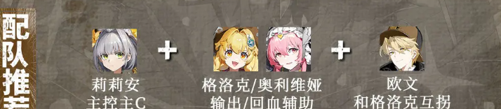 而在配队的推荐上面,莉莉安还可以作为阵容当中的主要控制以及主要核心输出角色使用,那么第二个位置上,大家放格洛克或者是奥利维亚都是可以的,这里格洛克的话是可以帮助莉莉安来补足一些输出的,然后如果放奥利维亚的话,为队伍带来的则是治疗以及辅助类型的效果,这两个角色目前都是可以跟莉莉安放在一起凑光属性的羁绊加成的,所以如果有需求的话,大家根据目前队伍上场的情况来进行判定,如果上场的对手是输出比较强大的角色,那就上格洛克来保证我方的输出数据能够足够应对对方,如果对方的异常攻击比较强大的话,大家就可以让奥利维亚放在这里,来保证队伍有足够的生存能力。