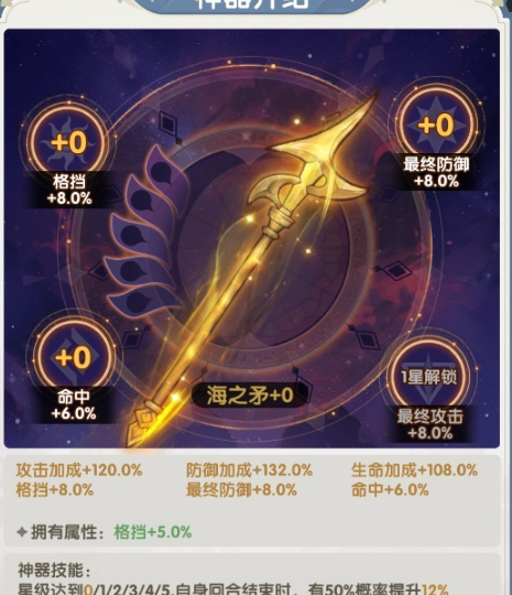 从属性面板上看,海之矛提供了攻击加成+120%、防御加成+132%、生命加成+108%,同时还带有最终防御+8%、格挡+8%、命中+6%。这些加成整体数值不算特别高,却覆盖了输出与生存的核心维度。