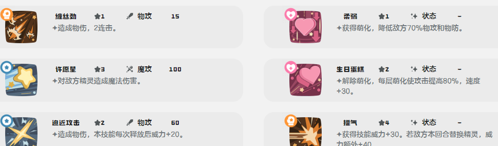 从输出方面来看,超级糖果就是绝对的主力,会有130威力的物理性伤害,这点还是很给力的,直接就可以获得一个萌化状态。触底强击也很有意思,魔法伤害基础大概是60个威力,要是放技能就刚好是能量耗尽。威力数值可以先加100打爆发还是比较好用的,另外还有一个迫近攻击。每一次在放完之后,威力就可以直接上涨20,叠加几次之后就可以直接叠满伤害,对于血厚的对手还是很管用的。