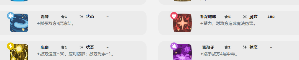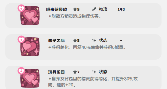 休息回复就可以直接回30%的血,作用于日常还是足够的。更厉害的是还有一个应激反应,普通的情况下大概就可以回25%的血,要是遇到对手防御反击,那就可以直接回80%的血。残血反打,那全部都需要靠他。另外还有一个赤子之心,不仅可以回40%的血,而且还可以获得6点能量。整体的性价比还是比较出色的,除此之外增益技能也是主要的亮点。柔弱可以把敌方的物理性攻击还有物理性防御直接下降70%就可以给我方创造出更多的机会。