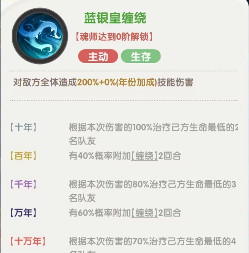主动技能「蓝银皇缠绕」:根据魂环年份提供不同效果,包括群体伤害、多目标治疗及概率缠绕控制,十万年魂环更可治疗四名队友。