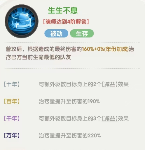 被动技能「献祭」:牺牲自身复活队友,并在一回合后复活,高阶魂环还可提供攻击加成与护盾转化。