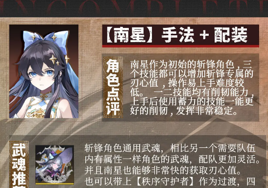 南星武魂并不追求一步到位,而是应该按照实际情况来分阶段的搭配。在刚刚入坑时,因为没有太多的抽卡资源就可以选择秩序守护者。优势是很直观的,主要是获取难度比较低,不需要特意的去抽卡,一开始的任务是可以轻松拿到的。另外操作的门槛比较低,并不需要复杂的技能衔接,只要跟着基础输出节奏去打,马上就可以发挥效果。另外适配性还是比较出色的,可以完美契合它的核心机制。在搭配使用时就可以提前开出终结技能,打出一个爆发性的伤害。
