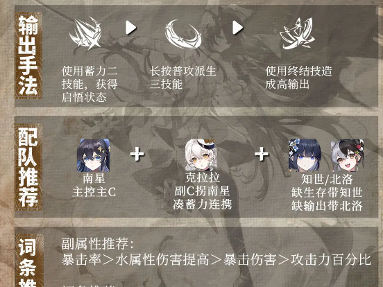 装备的副属性应该按照暴击率还有水属性伤害提高以及暴击伤害,还有攻击力百分比的顺序来选择。这么选择的原因是很简单的,他的技能伤害本身就是以水属性作为核心。水属性伤害提高,就可以直接加成所有的技能输出。暴击率就是保证稳定输出的关键,应该优先堆到50%以上,就可以避免频繁出现白字伤害。之后还可以补充暴击伤害,可以放大暴击时的伤害上限。最后用攻击力百分比去补充基础性的伤害,这样的搭配就可以让每一点的属性就可以直接用在刀刃上,可以避免属性的浪费。装备特效词条首选,双效调优,还有临界爆发。双效调优就可以提升技能衔接的流畅度。