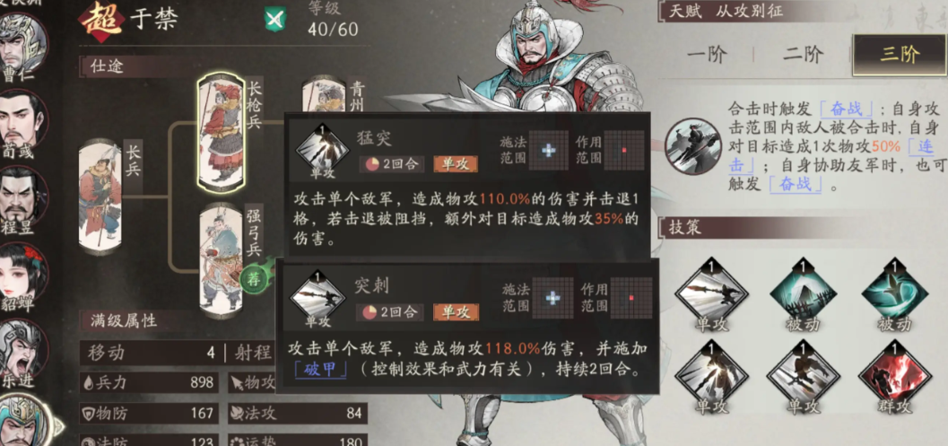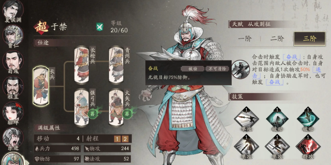 于禁在游戏当中的定位是一个远程骑兵,其三阶段的“奋战“效果,可以无视目标75%的防御,同时在合击技能触发时,自身对敌方目标会再次造成一次,基于自身物理攻击倍率50%的连击效果,协助队友的同时,于禁也可以触发奋战状态。
