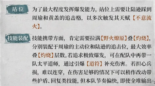 技能携带方面,肯定需要拉满【野火燎原】叠【灼烧】,分别装配于周瑜的主动位和陆逊的追击位,最大效率叠【灼烧】层数。若追求极致爆发,可在配队中再带一队太平道师,通过引爆【道符】补充伤害。若担心兵损,难以连穿,在伤害足够的情况下可以稍作改动带些护盾、回复类技能,但本队节奏偏快,即使全堆输出也没问题。