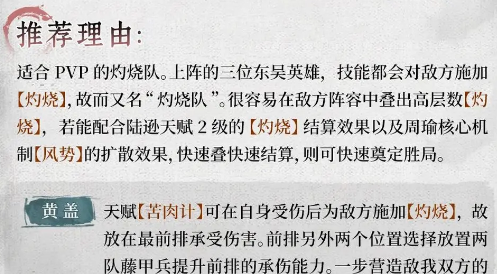 适合PVP的灼烧队。上阵的三位东吴英雄,技能都会对敌方施加【灼烧】,故而又名“灼烧队”。很容易在敌方阵容中叠出高层数【灼烧】,若能配合陆逊天赋2级的【灼烧】结算效果以及周瑜核心机制[风势】的扩散效果,快速叠快速结算,则可快速莫定胜局。