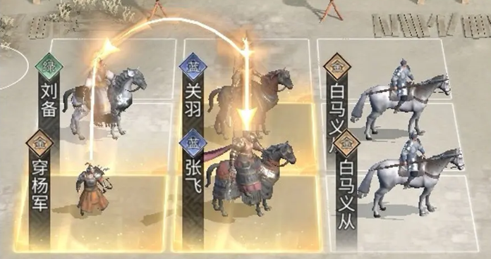需要让关羽踩到刘备、张飞二位的追击格,以最大化关羽的输出;刘备的另一个追击格可考虑上阵有着不错词条和属性的弓兵、术士,往往也能打出不俗的输出。