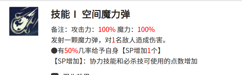 空间魔力弹和伯德家族的矜持是兰吉尔斯的主动技能,空间莫丹谈是一个攻击力和魔力均为100%的技能,这个技能可以对敌方1名敌人发送1颗带有着高额伤害的魔力弹,魔力弹命中目标的时候还有50%的可能性会给自身附加上1个sp,sp指的是协力技能和必杀技,sp增加后兰吉尔斯的协力技能和必杀技的可用点数都会出现增加。