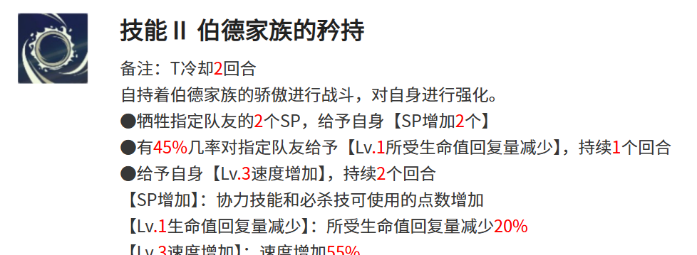 伯德家族的矜持这个技能是需要兰吉尔斯保持着伯德家族的骄傲去和对手战斗,该技能主要作用就是强化自身的能力了,使用该技能后,兰吉尔斯可以直接牺牲指定2名队友的sp,将牺牲队友的sp赋予到自己的身上,且还有45%的几率给队友附加上所受生命值回复量减少的效果,自身可以被赋予速度增加效果,sp点数也会随之增加。