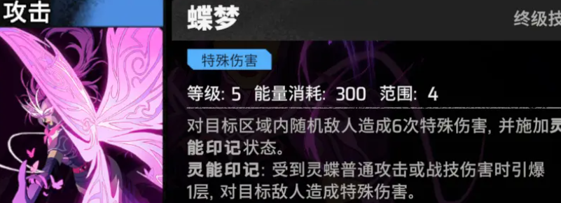 大家还可以使用理智1,进一步的追击伤害,还有一个终极技能伤害也是非常高的,但是需要后续大家来不断的进行触发,项终极技能是可以到目标区域当中来,对某个随机敌人造成六次的特殊伤害,并且还可以增加灵能印记的状态,只要受到普通攻击或者战斗技能伤害的玩家们,都可以引爆一层,还可以对目标敌人造成特殊的一个伤害,玩家们在使用战斗技能时,可以来消耗单体的伤害,获得追击的资源,但需要注意的是,位移是不能够选择落点的位置。
