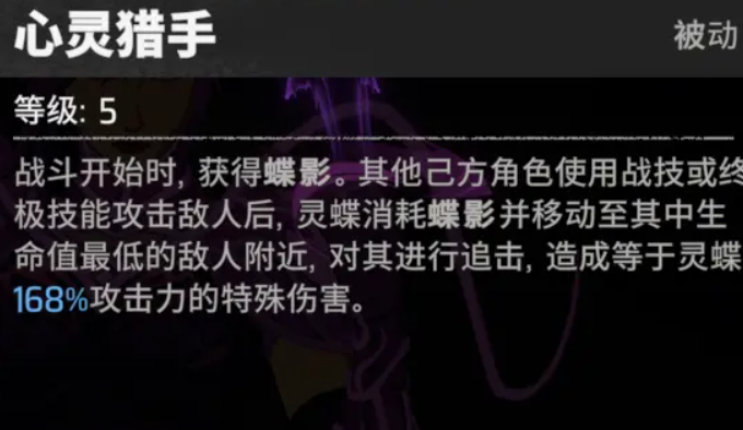 大家只能够接近敌人来造成特殊的伤害,无视对方护盾的效果,接着就是战斗技能意识化蝶,这个技能也是可以移动到目标敌人的位置,来对左右双方敌人造成特殊的伤害,还可以获得谍影,提高整体的伤害,这个技能会持续十秒钟的时间,大家可以来选择落点的位置,增加范围性的伤害,玩家们在使用的过程中,可以搭配高光时刻和神器来进行使用,还有一个专属卡也可以来获得增益的效果,选择神器的过程中,可以选择一个增加攻击,一个增加暴击的神器。