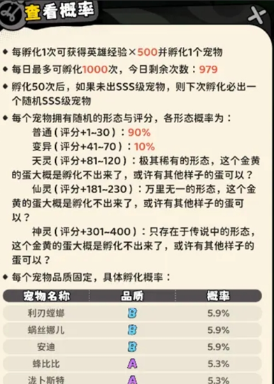 4、孵化机(抽卡)只能抽到普通和变异两种形态的宠物,前期可以适当抽取变异SSS宠物,资质最高。后期只需要用获取的免费抽卡券抽即可。