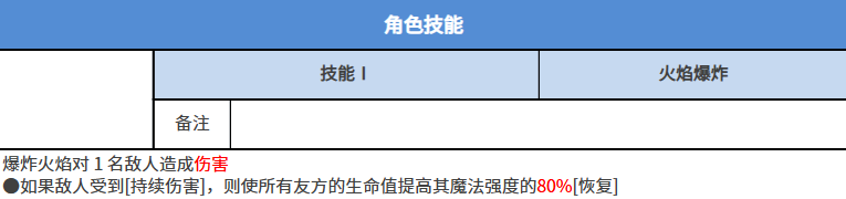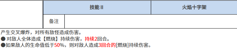这里的增益是根据友方的生命数值来提高她们魔法上面的强度,这里的话,达到的是80%的提升效果,所以作为一个给敌人带来持续伤害的同时给自身带来团队增益的效果来说,是比较全面的能力,那么她的技能2上面也是利用火焰带来更强大的能力,那么这里使用的火焰效果是技能效果是火焰十字架,在上面实战当中会产生一个交叉爆炸的效果,此时那么覆盖到的敌人是群体的目标,所以算作是一个大范围的群体伤害能力,此时如果对敌人造成这类爆炸输出的话,还有一个额外的机制就是燃烧有一定的概率可以触发。