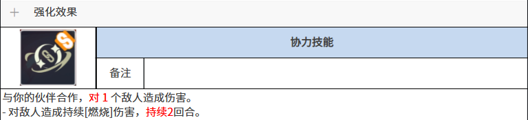 那么在后期的羁绊达成了之后,这个协力技能还会变成对所有的敌人都造成联动伤害,所以就会变成一个群体的效果,这里的敌人。同样是会有群体的燃烧可以施加的,最后在觉醒被动上面,她是给自身带来一个减伤的能力,在这里如果她觉醒的话,产生的被动效果是会在受到敌人伤害的时候减少4%的数值,不要小看这4%的数值,在关键时候这4%就可以起到让她足够生存的效果了。