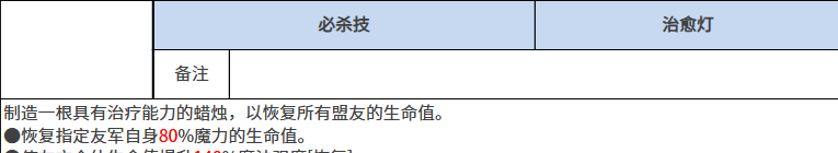 如果触发的话,一般都是会给全体的敌人都带来燃烧的触发效果,燃烧在生效之后,后期会持续带来后面几个回合的伤害能力,这里的燃烧一般持续是在两个回合里面,如果在敌人血量低于一半的情况下触发这个燃烧的话,那么这里的燃烧持续伤害在持续回合上面是达到3个回合的,所以在后期使用燃烧的效果下上面,持续输出的时间会更强一些,后期使用必杀技的话,那么带来的效果是有一定治愈效果的,这个技能叫做治愈灯,在上面使用的时候,角色会制造出来一根具有治疗效果的蜡烛,这个蜡烛可以恢复所有队友的生命数值,当然不是百分百的恢复血量数值,而是根据友军身上的魔力数值来进行恢复。