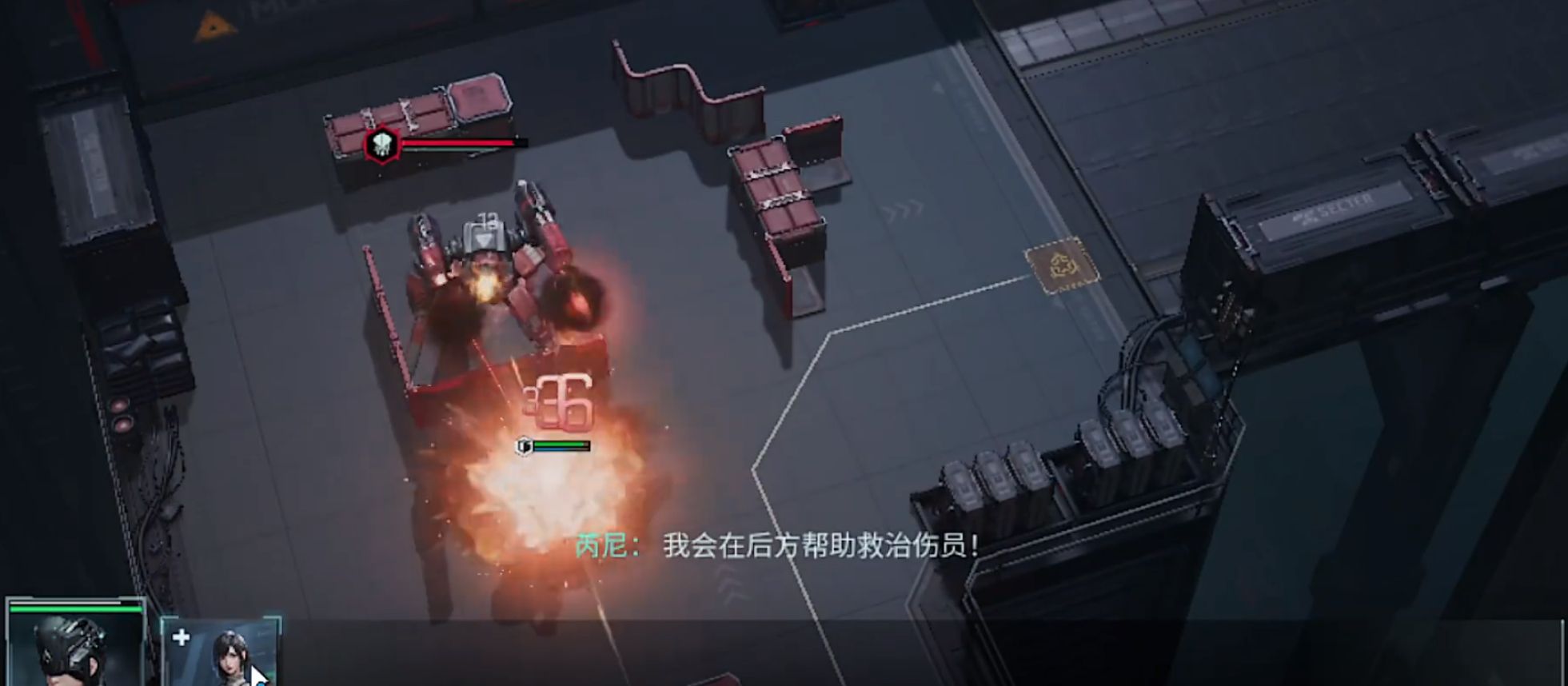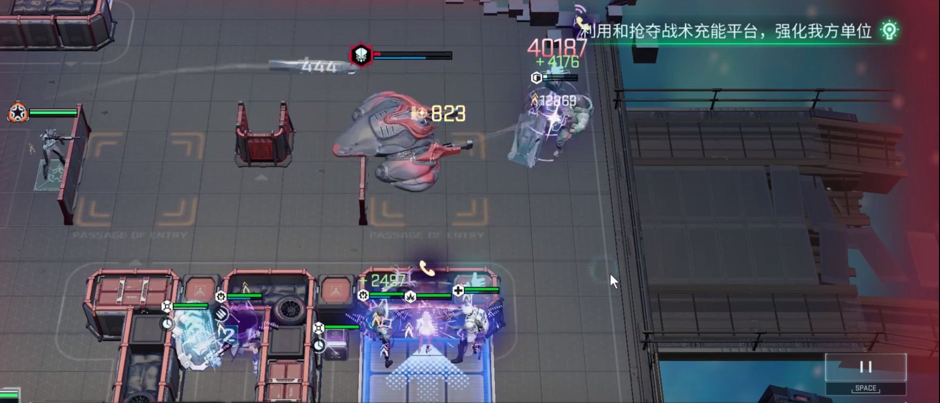 在0到30秒的初始部署阶段,我们可以优先折跃海洛到boss的侧前方2格,再对boss发动嘲讽让boss朝向固定,利用掩体挡下正面AOE。然后再将8号放置在梅洛的侧后方7格内,单次部署可以减少十分之一的护盾。最后在放置医疗兵到重盾的侧后方。