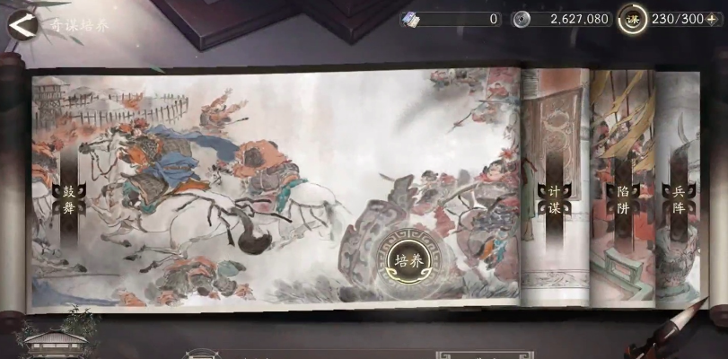 参谋是是研习奇谋的重要场所,他结合了鼓舞、计谋、陷阱、兵阵这四大类奇谋,玩家在战斗过程当中离不开这四部分,在这里可对这四部分的启蒙进行快速培养和学习,不过每一次的学习都会消耗一本奇书和1000个银币,目前游戏当中的奇谋包括上百个,从哗变之策到伏兵之策,再到一鼓作气、猛火计,玩家都可一一进行学习。