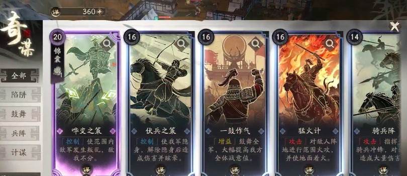 而在兵阵类奇谋当中,奇兵天将主要针对于步兵,骑兵阵主要针对于骑兵,掎角之势可针对于全部兵种,玩家可以着重培养掎角之势,可直接释放一个持续三回合的阵法,赋予己方军队攻、守、辅三种效果。