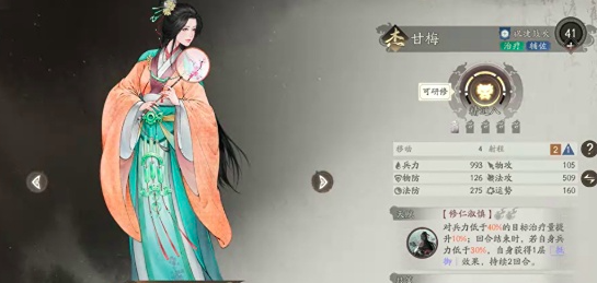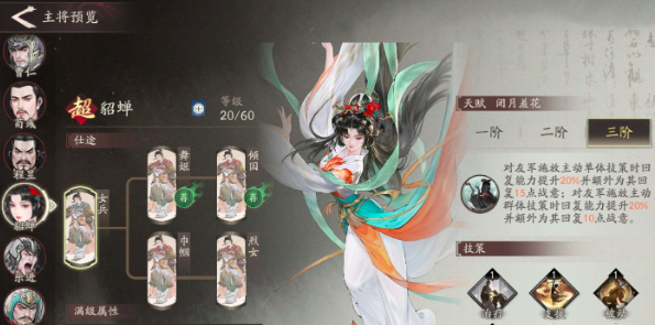 第三个女将角色是甘梅。这个角色的定位是辅助型武将,凭借着极强的治疗能力和减益驱散能力,在团队中的重要度非常之高,而且对于整体团队的战斗续航能够实现更强效果。其主要技能为设计精巧,对于各类战斗环境都有着高强度的作用,尤其对于一些高压的乘坐站来说,能够直接拉长战斗时间,对敌方进行快速挖掘,并完成己方支援。如果能够成功触发克制关系,那么全队攻击力可提升10%,同时将敌方的伤害值再降低20%。