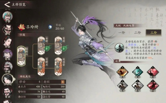 第一位女将吕玲绮,在游戏当中它主要以爆发技能为主,在短时间内可打出成吨伤害,整体的战法衔接也非常流畅,比较类似于夏侯渊,不过他在游戏当中以近战路线为主。角色在移动20次后还可以进行双次攻击,并对移动能力较低的地方可加成伤害。该角色比较推荐的技能是御风、奔袭和弧光掠影,御风和奔驰能够高效放大该角色的天赋,被动技能。而弧光掠影可以让该角色实现快速切进战场,与敌方完成战斗。