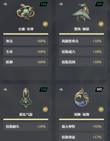 核心必带的魔之楔还是比较多的,例如选择全盛安神,可以获得84%的攻击,还有84%的防御以及84%的生命。生命以及防御加成就能让角色在近战贴脸打时更加的抗打。不管使用哪一种武器都可以很稳定的站在前排,就属于一个全方位提升的选择。那接着自然就是挑选凛风燎原,可以获得18%的风属性攻击,还有18%的技能威力以及18%的技能范围,就能完美符合风属性输出的定位。在使用突击枪时,风弓还有技能威力加成就可以让单体爆发更出色。