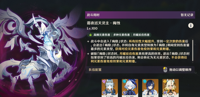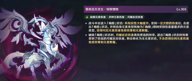 首先,我们先来看看这期危战的boss,第一关是新出的霜夜巡天灵主,我们一般称之为天马。
