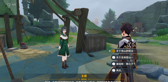 在营地和玉霞对话,询问雪山的情况,她会提到一种奇怪的冰堵住了道路,随后我们前往调查。
