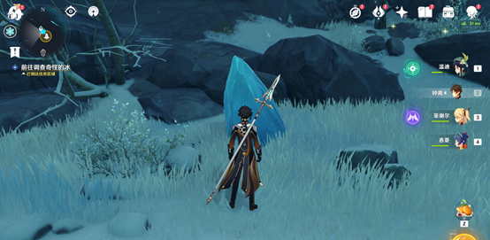 跟随任务指引通过传送点后发现古代坚冰,这些冰块无法被融化,只能依靠捡起深赤之石后的下一次攻击对坚冰造成一定伤害,重复4次后坚冰破碎。