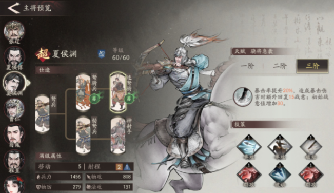 如果小伙伴们的手中比较缺远程输出型的角色,那么小编比较推荐的是夏侯渊,当升到二阶之后,他能够为队伍带来15%的暴击率加成,如果说你平时比较喜欢玩弓兵体系,那么夏侯渊绝对是一个必须要培养的角色,而如果说你手中的角色大多比较脆皮,急需一个治疗的话,那么夏侯淳就是你的首选了,升至二阶之后,它可以在残血状态下恢复32%的兵力。