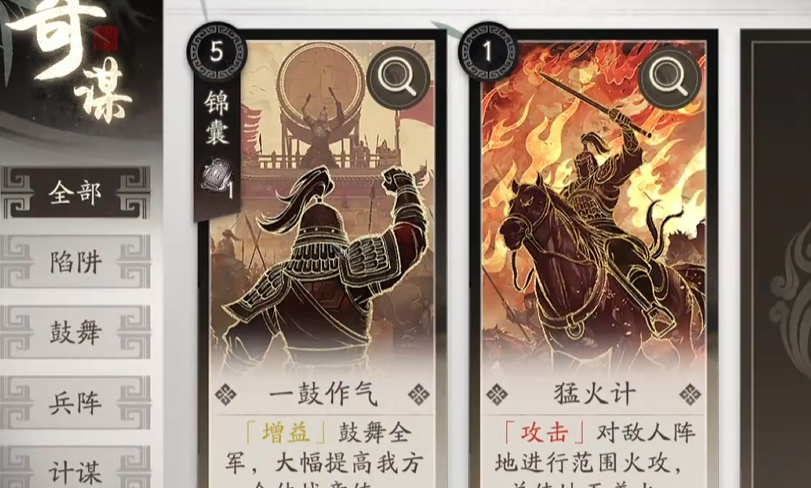 在这一关中,如果想要顺利通关的话,除了战胜所有的敌人还需要达成一些特殊的条件,也就是使用4次克制和一次奇谋,因此小伙伴们在开局之后就可以直接进入奇谋系统了。在这个配置下是有两个奇谋可以使用的,小编比较推荐的是猛火计,可以直接对敌人进行一个范围性的攻击。但是猛火计也是有缺点的,那就是在它的范围之内是不分敌我的,如果说己方成员在燃烧范围之内同样会受到伤害,因此小编建议大家释放之前看准时机和位置。