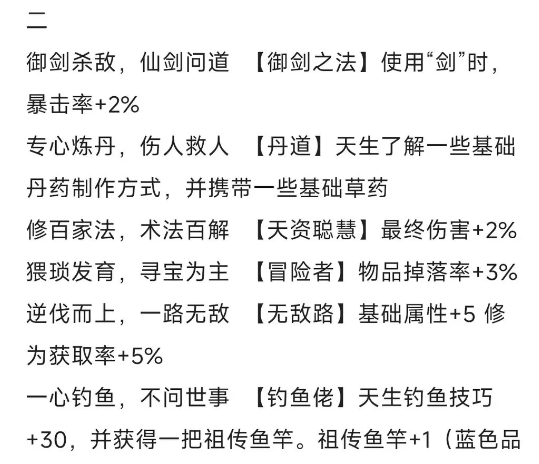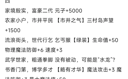 4.家境殷实,富豪二代 元子+5000(为什么这里选择元子,因为前期用元子的地方很多,比如筑基丹,做任务也需要;武学世家是自带野球拳,其实没必要练,前期所有门派都一样,不如王八拳过渡平滑,选择乞丐是睡梦罗汉拳,ps:一坨)