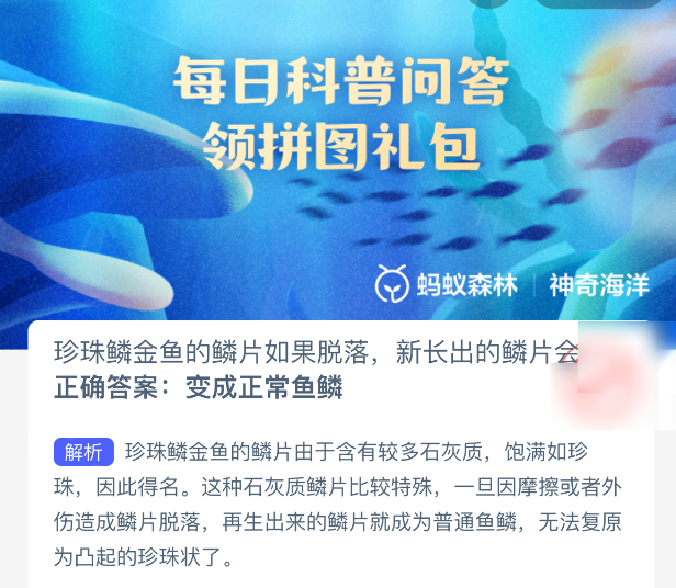 以上就是珍珠鳞金鱼的鳞片如果脱落,新长出的鳞片会?神奇海洋今天答案最新2025年11月5日分享,更多相关攻略内容,请点击关注更新!