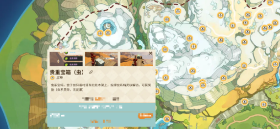 还有虫系宝箱位置是在信仰者村落的东北边。注意不要只看地面,可以抬头看一下木架的位置,在解锁时就需要重系精灵。主要的奖励就是无花果,还有虫系灵碎,如果玩家正在培养化蝶,那就需要这一些材料。