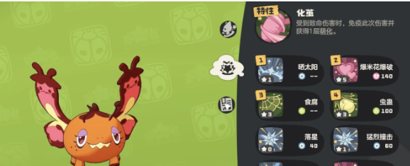 化茧这就是化蝶的特性,也是关键的保命技能。在第1次受到致命伤害之后就可以免疫,然后进入到萌化的状态。这一个机制就可以帮助化蝶多支撑一轮反击,还能触发萌化专属的效果,因此后续在搭配技能还有挑选性格时,都应该注重于这一些方面。那性格的选择其实就应该注重于技能的流派,追求输出的就应该选择保守或者稳重,这些性格就能有效提升魔法攻击可以造成更高的伤害,从实用性这一方面来看还是很不错的。