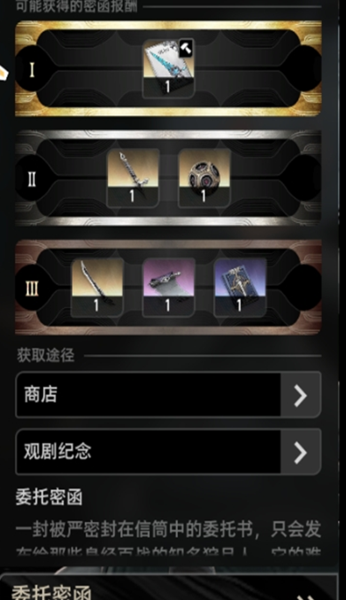 在拥有武器密函后,在委托密函里选择对应的密函即可定向刷取,此处可以看到密函通关后可能出现的3档奖励: