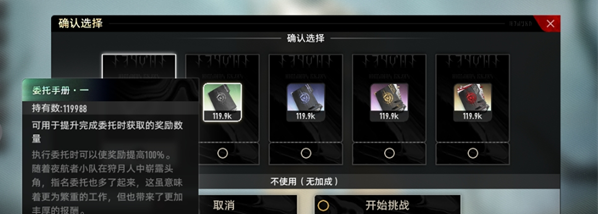 (在委托界面点击开始挑战后会弹出委托手册使用界面)