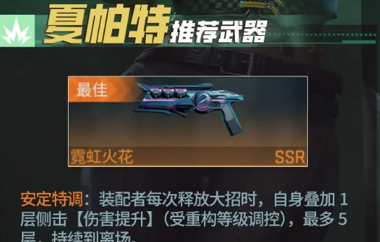 绝佳的武器就是霓虹火花,这把武器的效果还是很厉害的,在每一次释放大招之后都可以提升侧击的伤害,最多就可以叠加5层效果也可以一直持续到夏帕特离场。不管夏帕特是走侧击流又或者是大招流,那侧击都是很重要的来源伤害。在叠满5层之后,侧击的伤害就会有明显的飞跃,后期养成越深入,那输出也就会更猛。