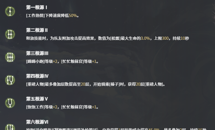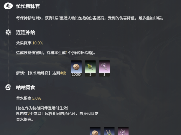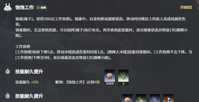 饱饱够给你做技能在骑乘小猪时能额外获得100点工作热情,提升移动速度并对沿途敌人造成伤害。忙忙粮秣官技能每次释放后都能获得重磅人物效果,最多叠加10层,可以降低受到的伤害并提高输出能力。
