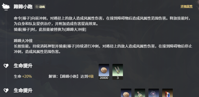 蹄蹄小跑是松露的核心技能之一。发动时可以让小猪向前冲刺,对路径上的敌人造成风属性伤害。同时还能为自身及附近队友提供治疗效果和伤害加成。在骑乘状态下,这个技能会得到强化,长按技能键可以持续消耗神智来维持效果。