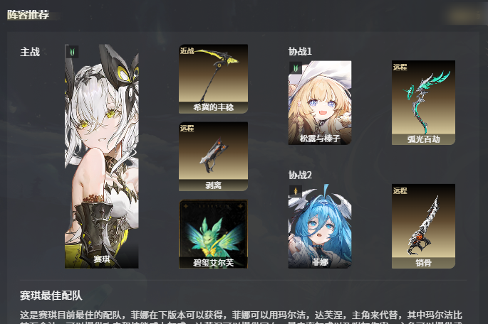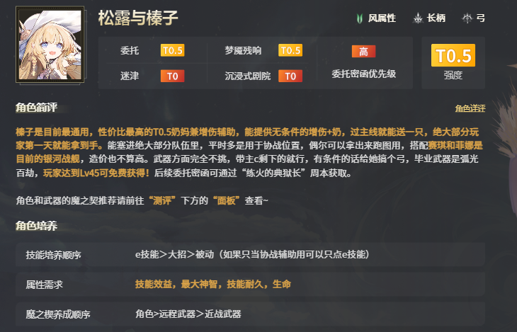 榛子是目前最通用,性价比最高的T0.5奶妈兼增伤辅助,能提供无条件的增伤+奶,过主线就能送一只,绝大部分玩家第一天就能拿到手。能塞进绝大部分队伍里,平时多是用于协战位置,偶尔可以拿出来跑图用,搭配赛琪和菲娜是目前的银河战舰,造价也不算高。武器方面完全不挑,带主c剩下的就行,有条件的话给她搞个弓,毕业武器是弧光百劫,玩家达到Lv45可免费获得!后续委托密函可通过“练火的典狱长”周本获取。