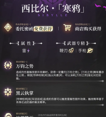 西比尔的基础属性为雷属性,其被动技能“万军之势”,造成的伤害触发额外效果期间,一定会获得定量的万钧之势效果,万钧之势的存量具备有一定上限,可以使得西比尔,在释放夺神权柄以及指尖风暴时,消耗等量的能源,用于创造爆发伤害。