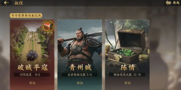 在三国群英传:策定九州里破贼平寇是个很适合日常刷资源的核心副本,不管是刚入坑需要攒材料的新手,还是后期想快速养武将的老玩家,都能从这里拿到不少实用奖励,这个副本藏在主界面的征伐模块里解锁门槛不高,刚玩没多久就能进去挑战,而且它有自己独立的战场,跟大地图上的攻城、打野这些玩法不冲突,就算大地图上的武将正忙着干活,也不影响在副本里调兵遣将。