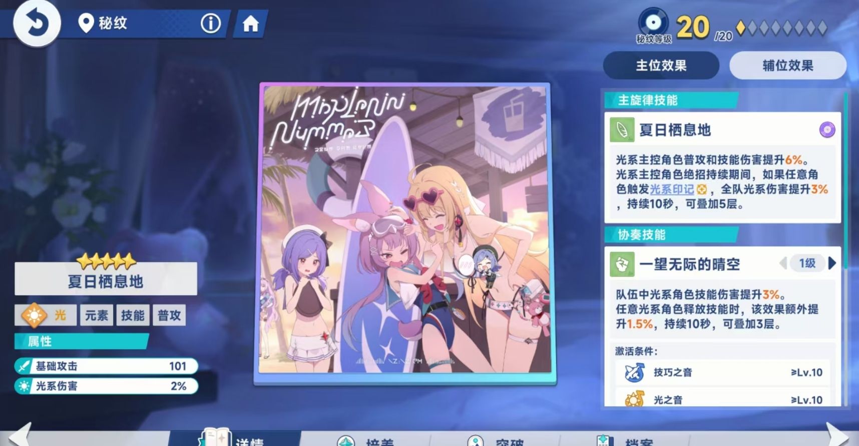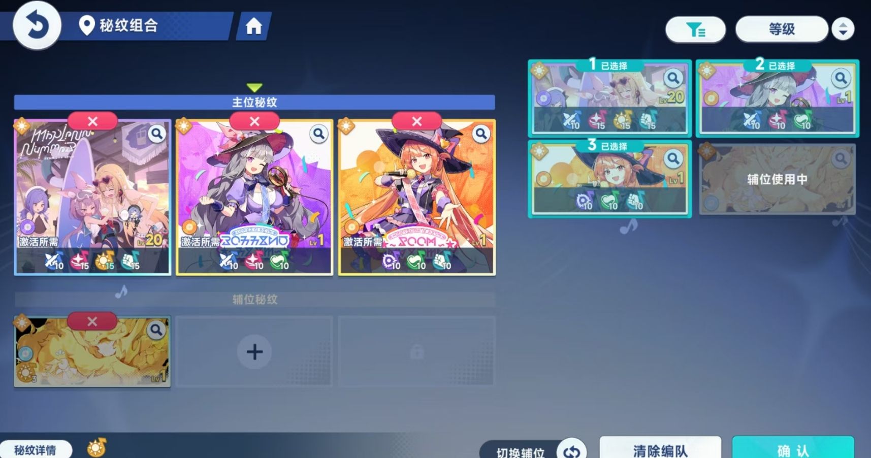 在进行主位秘纹搭配之前,各位先需要了解主位秘纹的作用。与辅位秘纹只起到一个提供音符数量的功能不同,主纹秘纹并不会为队伍提供音符数量,而是会为队伍带来它们本身的数值加成,以及主旋律技能和协奏技能的加成效果。其中,主旋律技能不需要音符进行激活,只要将秘纹装配在主位秘纹的位置上,那么该技能就会立刻生效。而协奏技能则需要在队伍获得一定数量和类型的音符后才能激活,激活后若是失去音符,那么协奏技能的效果也会随之失去,不会一直存在。