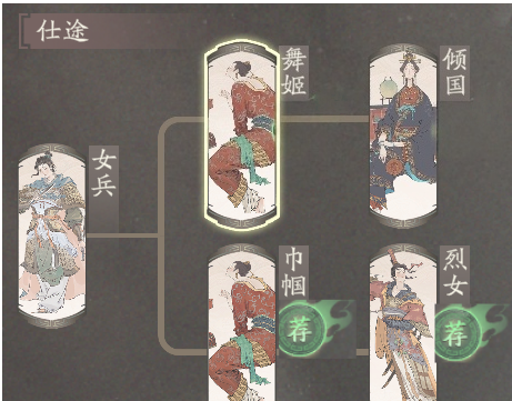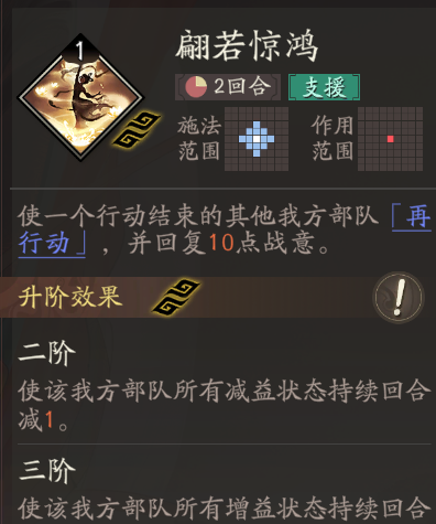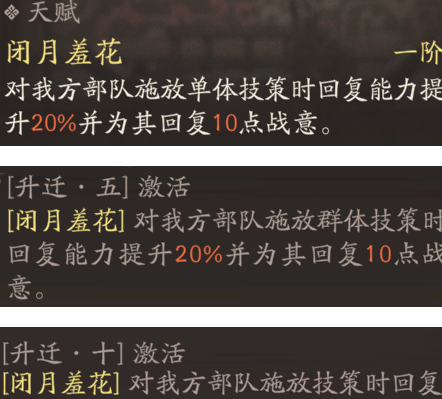 在升阶搭配时,就需要注重与技能的搭配,如果没有天赋要求,那就可以选择翩若惊鸿+舞影+扶危,其中翩若惊鸿是核心的在动技能,是必须要带的。扶危无冷可以奶血,而且还能够达到驱散的效果,可以轻松的缓解生存压力。天赋在达到两阶以上想要起到碾压的效果,那就可以选择翩若惊鸿+沉鱼落雁+援兵,沉鱼落雁就可以群体回血,而且还可以回复战意。配合天赋就能够给全队叠buff。还有一个援兵就能够弥补冷却空白打起来真的是又快又爽。