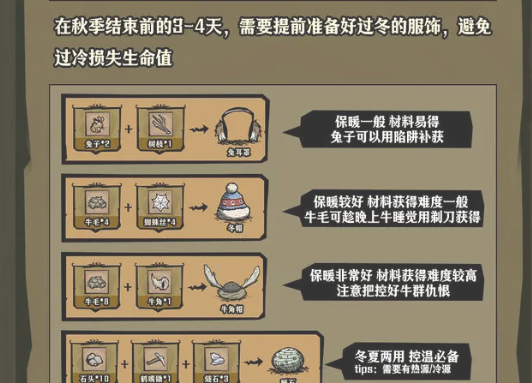 在秋季结束前的3-4天,需要提前准备好过冬的服饰,避免过冷损失生命值