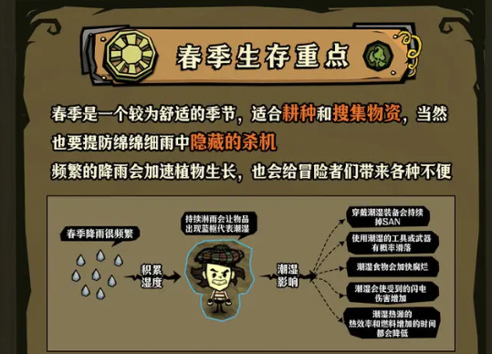 春季是一个较为舒适的季节,适合耕种和搜集物资,当然也要提防绵绵细雨中隐藏的杀机频繁的降雨会加速植物生长,也会给玩家带来各种不便。