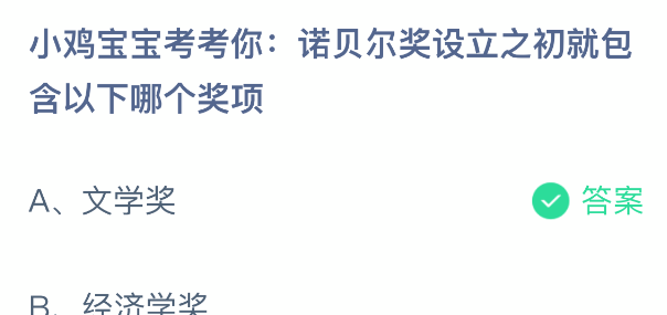 以上就是小鸡宝宝考考你:诺贝尔奖设立之初就包含以下哪个奖项,支付宝蚂蚁庄园2025年11月9日答案最新,更多精彩内容,请点击关注更新!